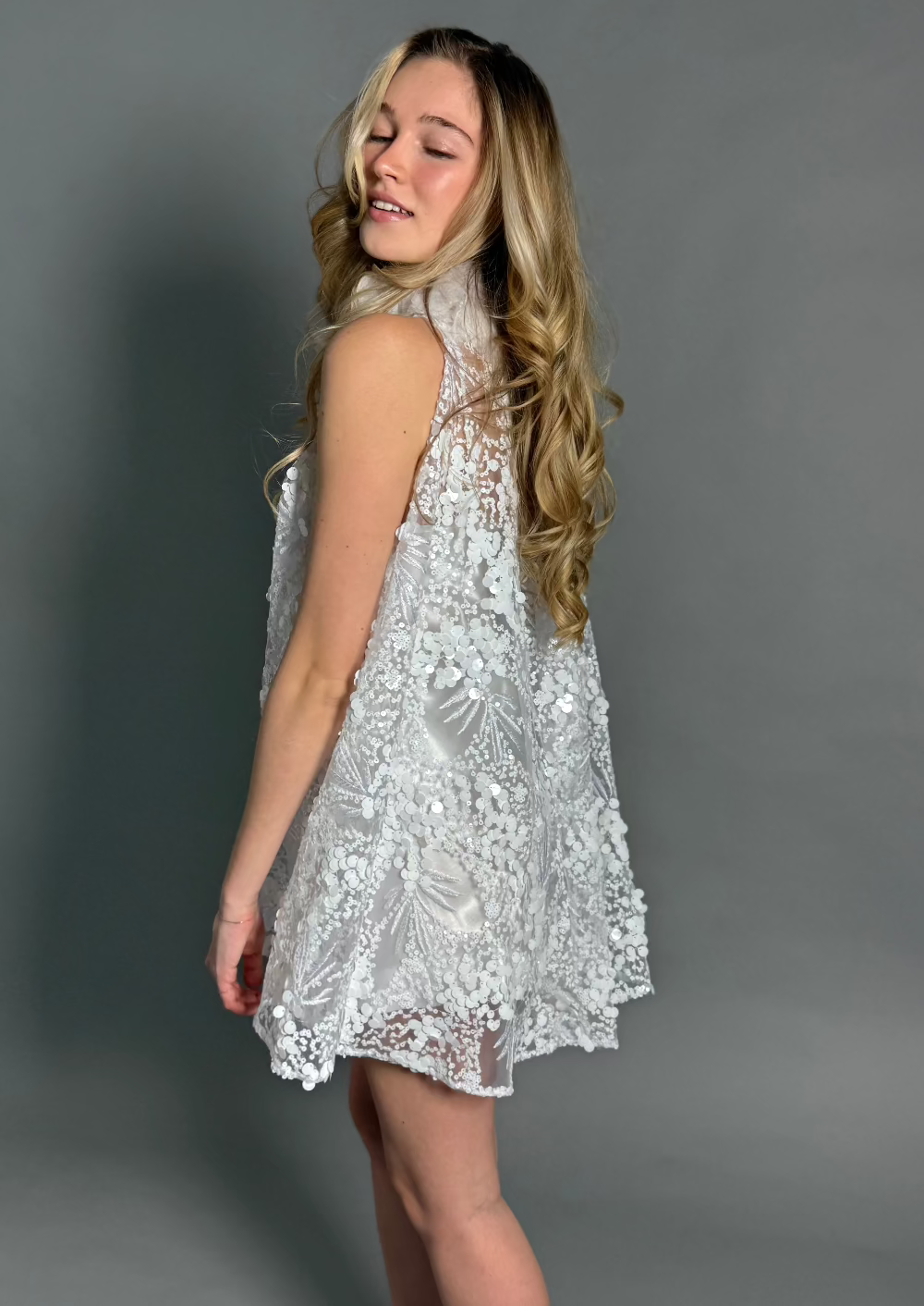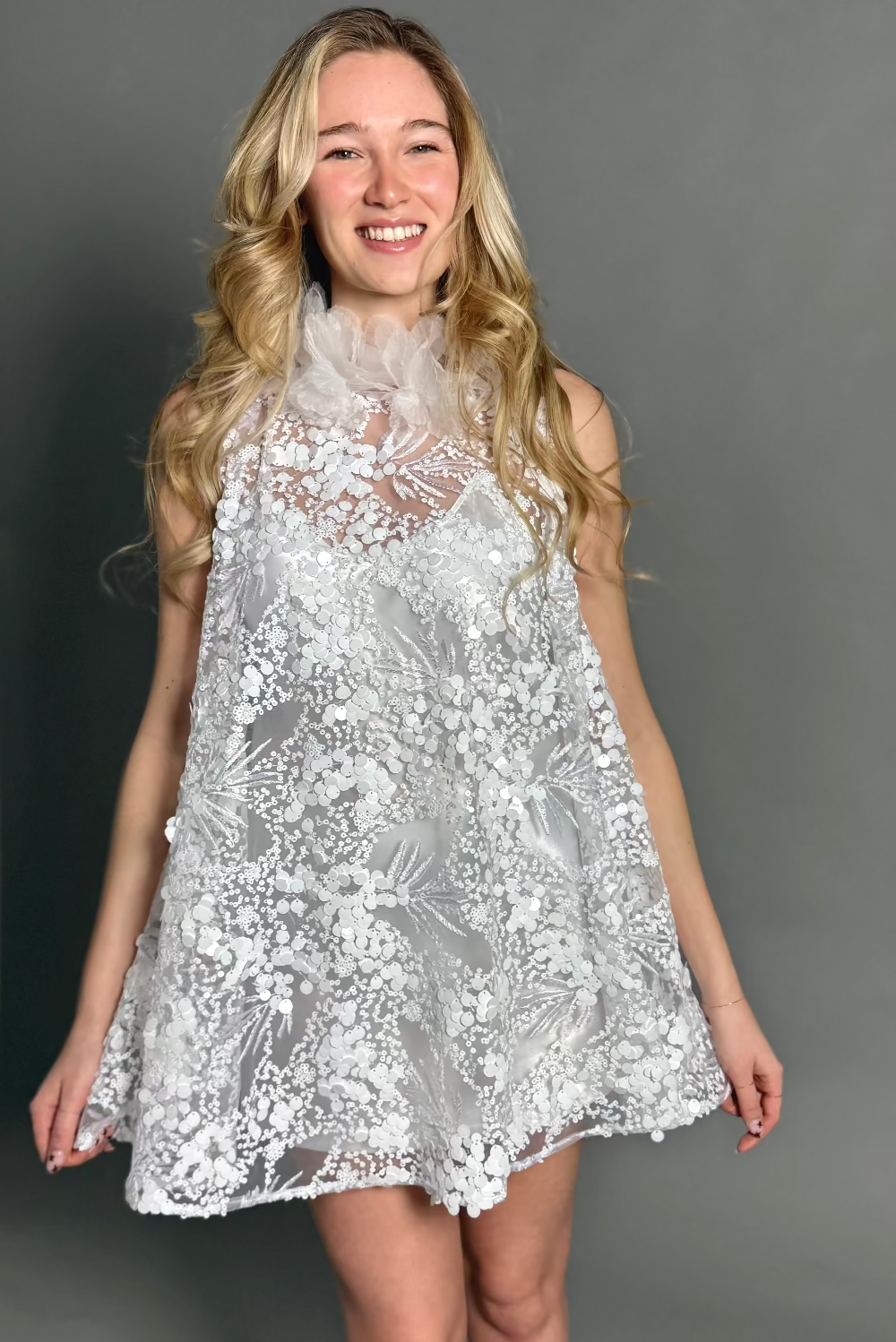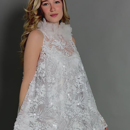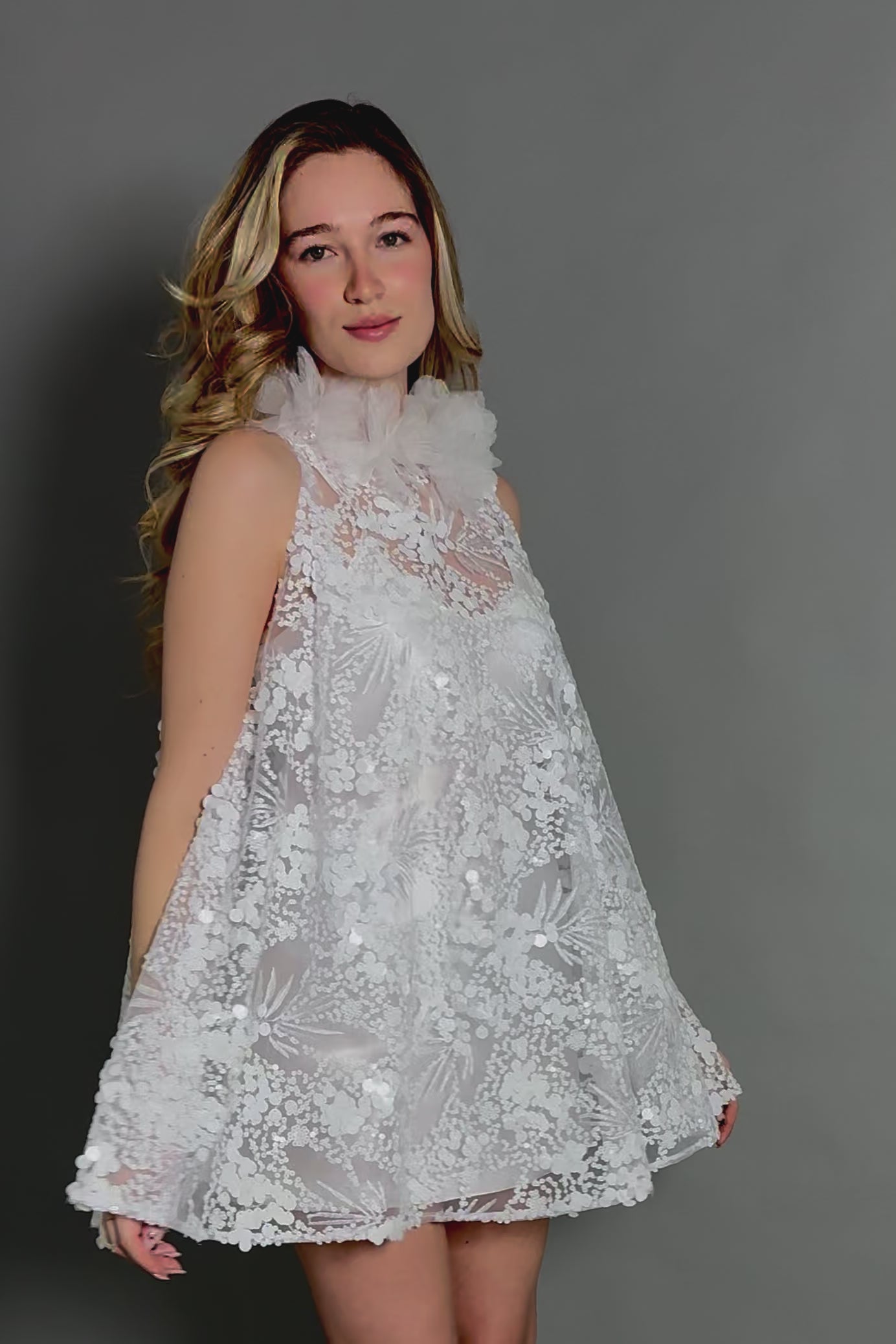 Abito corto bianco con paillettes, impreziosito da delicati fiori in organza con perline sullo scollo.